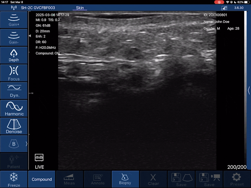 Der Hochfrequenz-Linearultraschall, ausgestattet mit einer linearen Sonde mit 192 Elementen, liefert außergewöhnliche Genauigkeit, um selbst kleinste Details zu erfassen. Mit einem Frequenzbereich von 15/20 MHz eignet er sich ideal für die Untersuchung von Haut und subkutanem Gewebe sowie für die visuelle Führung bei Eingriffen, die Untersuchung peripherer Gefäße, die Untersuchung oberflächlicher Organe wie Brust und Schilddrüse, die Führung bei Gefäß- und Gelenkeingriffen, die Führung bei inneren Fisteln, die Führung bei Nervenblockaden usw.