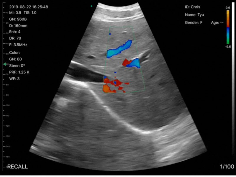 Farbdoppler-Versionen verfügbar: B+Color Doppler, B+Power Doppler Imaging (PDI), B+PW (Pulswellen-Doppler)