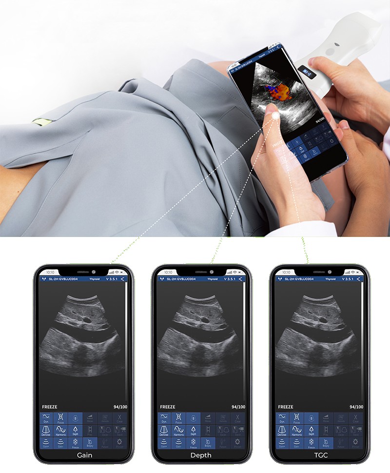 Einstellmöglichkeiten: individuelle Bildoptimierung durch Einstellungen wie B-Gain, TGC (Time Gain Compensation), DYN (Dynamikbereich), Fokusbereich, Tiefeneinstellung, harmonische Bildverarbeitung und effektive Rauschunterdrückung