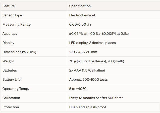 The Dräger Alcotest 1000 enables reliable and fast determination of breath alcohol concentration. The device operates with a high‑quality electrochemical sensor specifically designed for the analysis of alcohol in breath air. This sensor technology is characterized by high accuracy and repeatability of measurement values, which is advantageous both in professional environments and in workplace alcohol testing. The results are displayed clearly on the screen after a short measuring time, allowing immediate decisions. The device is designed to provide stable and consistent measurements in various application situations.